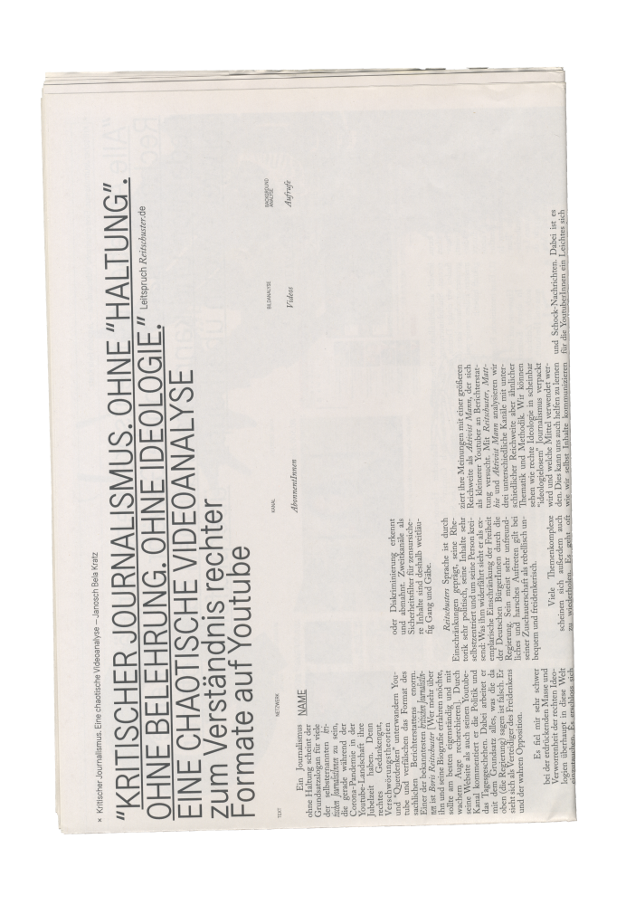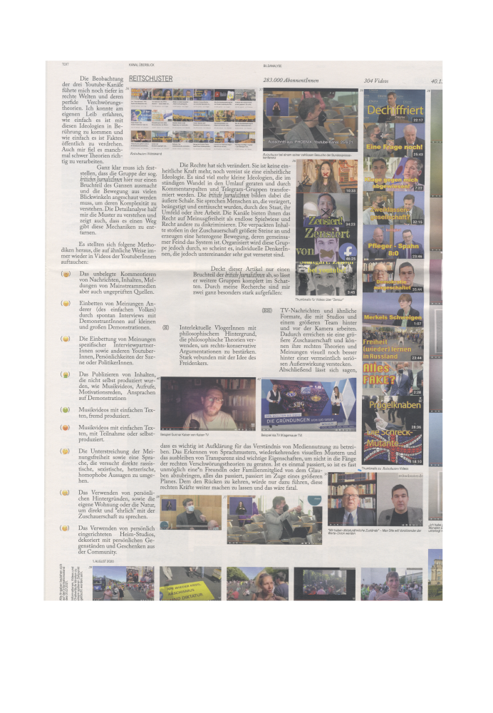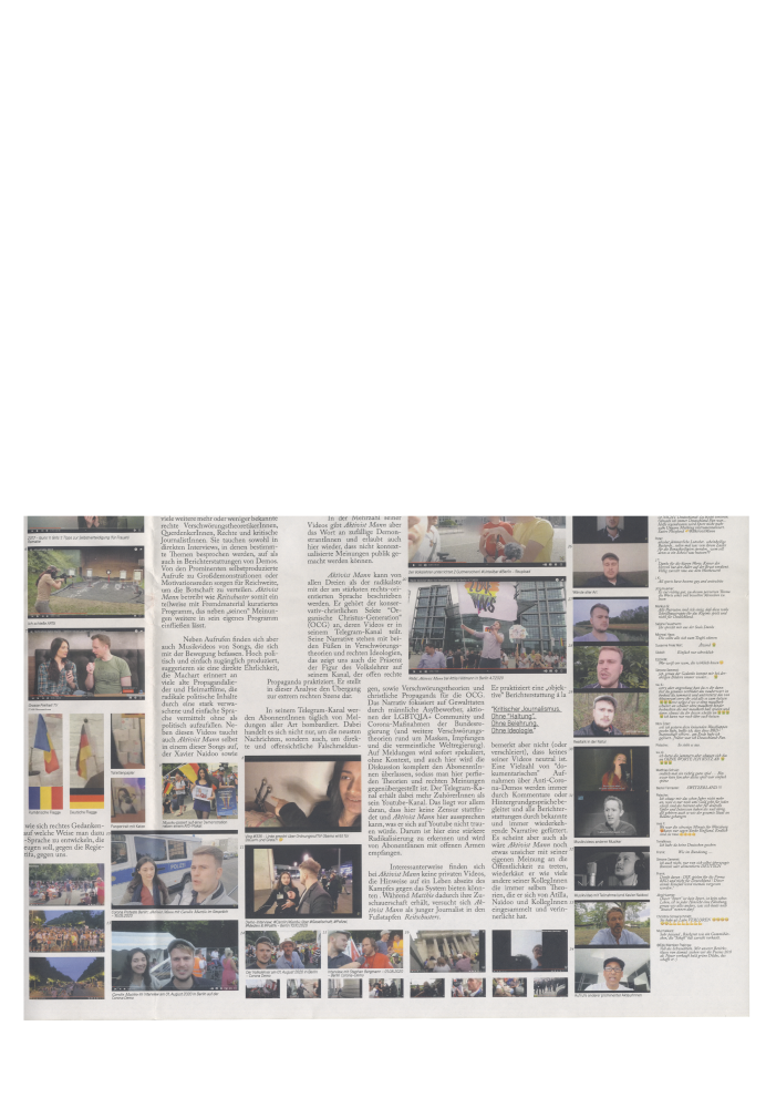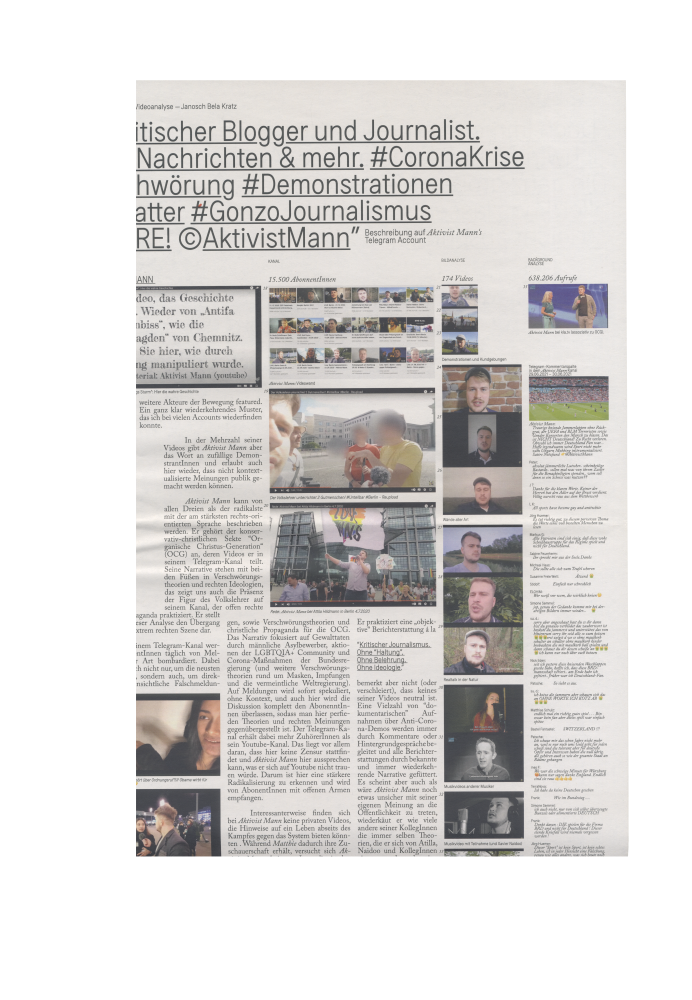 Besides other great texts and visual essays, the publication contains my essay about so-called “alternative journalists” in Germany. A video analysis of three different YouTube channels that connect a very vague group of people with a wide range of conspiracies and questionable political opinions. A cover-up that provides ground for ultra-right, anti-semitic, racist, nationalist, sexist, homophobic and xenophobic ideas! Under the excuse of freedom of speech, these influencers could benefit from the accurance of the coronavirus and their anger against the government regarding social issues. In one of their main naratives >the German government is a dictatorship operating under the cover of a democracy< In the movement seen as “revolutionists” the purpose of this kind of “journalism” is to make people insecure, introduce them to a wider range of fears and let them drift into the world of “Querdenker” to follow protests organised by politically right movements.