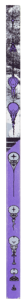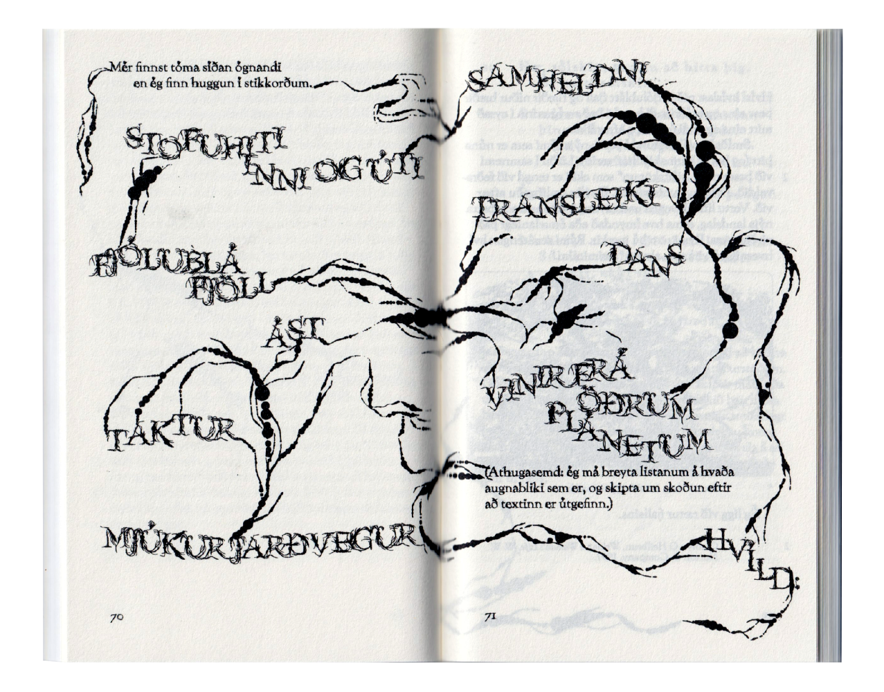 The publication is a hybrid of a catalogue for the works of all participating artists and a collection of three commissioned science fiction short stories. The framework of illustrations and the two new “nightmarish” cuts of the font Sorts Mill Goudy interconnect the narrative, visual concept, and structure of the book with Arna Beth Saulsdóttirs’ commissioned video work “Oneirokritikon” and her universe of dreamgivers – making the book an object of escapism itself. A vague dream language interconnects the content and leads through all pages of the book alongside illustrations of a growing homunculus. As the new font, they were drawn in a tool programmed in processing.