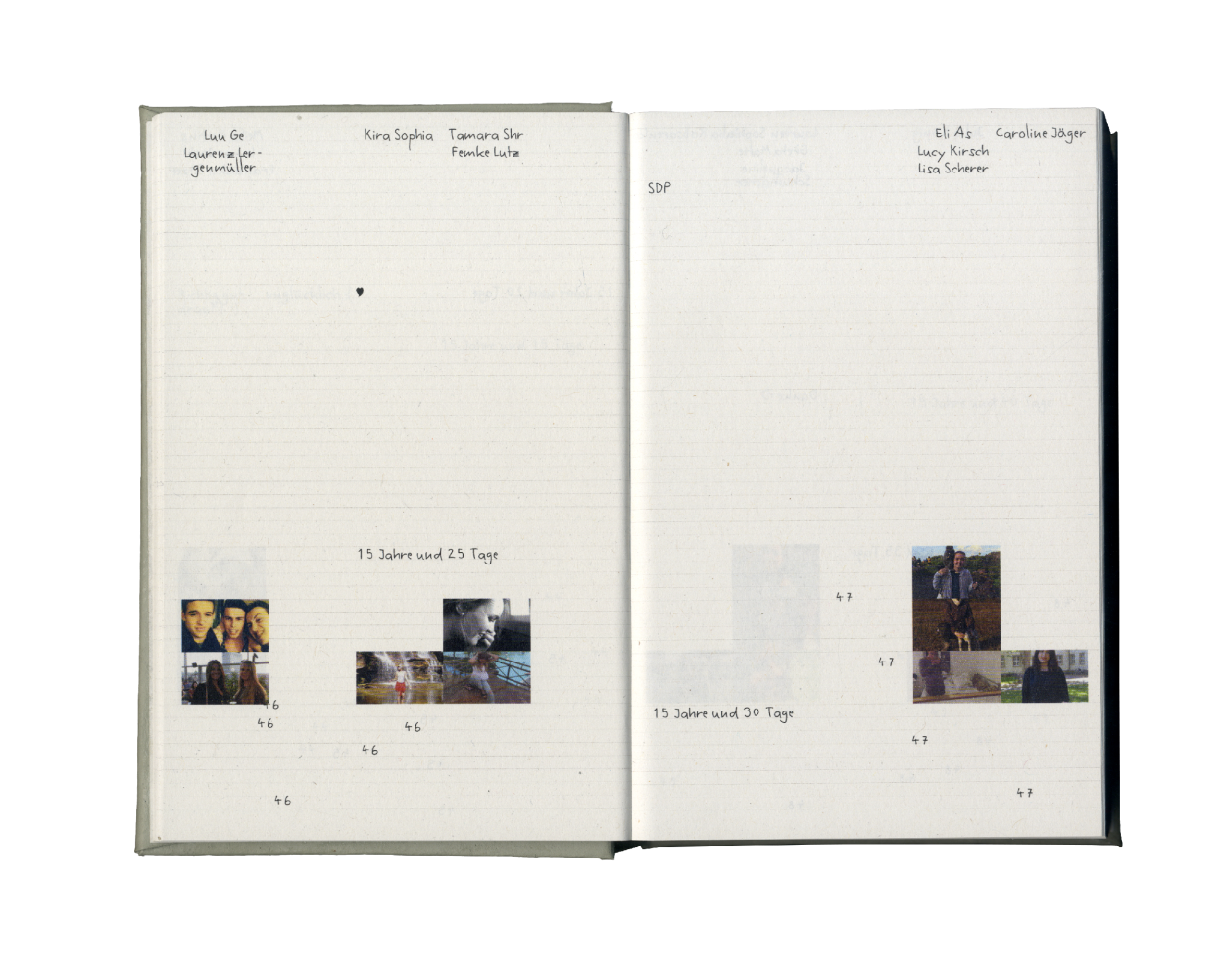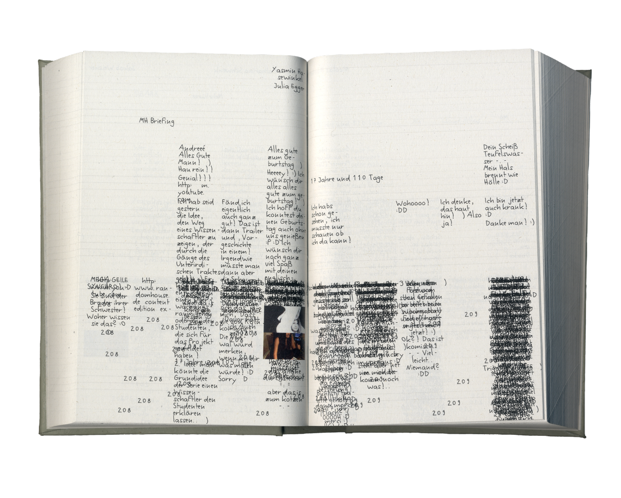 The book brings together all posts, pictures, friends, messages with two of my best friends, comments under posts and pictures and liked pages from 10 years of Facebook in a small grey book wrapped in skin-like paper. The last of the 730 pages contain articles from online magazines about love, sex, masturbation, physical changes and growing up. The page numbers grow like pubic hairs across the pages and the very thin paper conveys an intimate, fragile mood. My digitalized handwriting adds a personal touch to the diary-like layout.