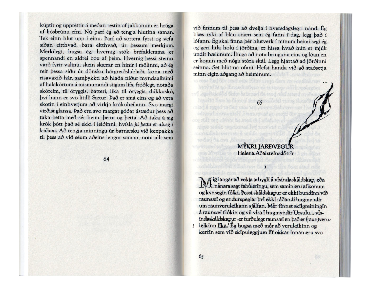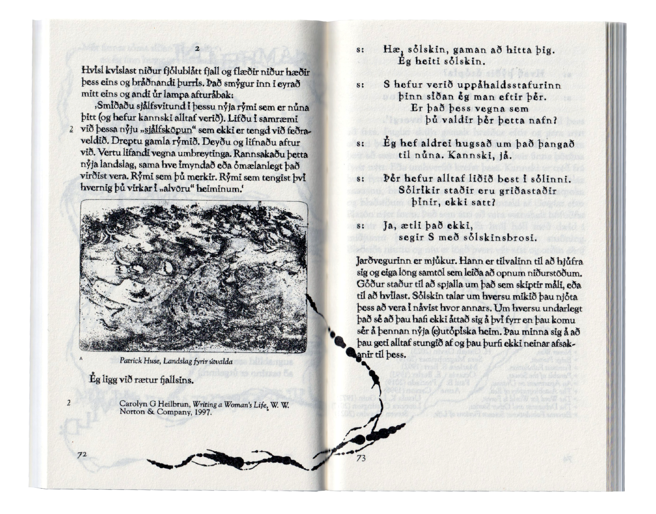 The publication is a hybrid of a catalogue for the works of all participating artists and a collection of three commissioned science fiction short stories. The framework of illustrations and the two new “nightmarish” cuts of the font Sorts Mill Goudy interconnect the narrative, visual concept, and structure of the book with Arna Beth Saulsdóttirs’ commissioned video work “Oneirokritikon” and her universe of dreamgivers – making the book an object of escapism itself. A vague dream language interconnects the content and leads through all pages of the book alongside illustrations of a growing homunculus. As the new font, they were drawn in a tool programmed in processing.