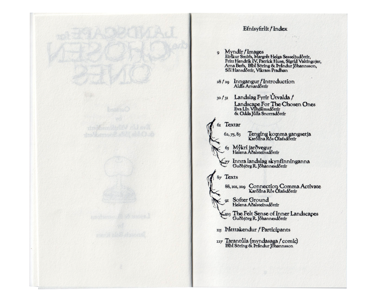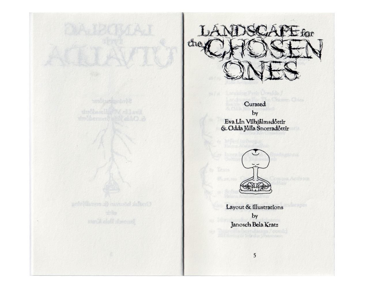 Exhibition catalogue for the show “Landscape for the Chosen Ones” for Hafnarborg Center for Culture and Fine Art in Hafnarfjörður (Iceland), curated and edited by Eva Lín Viljálmsdóttir & Odda Júlía Snorradóttir in 2023. The exhibition brought together a variety of works on escapism by Iceland-based artists.