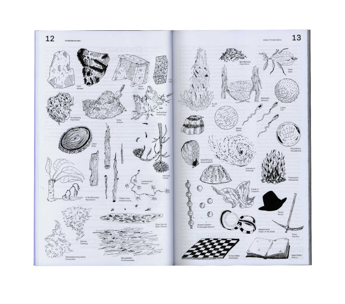Full-page illustrations accompany the 11 texts. The drawings form their own language which summarizes each chapter visually and adds to the reading rhythm. The meaning of each drawing is listed in an index at the beginning of the publication.